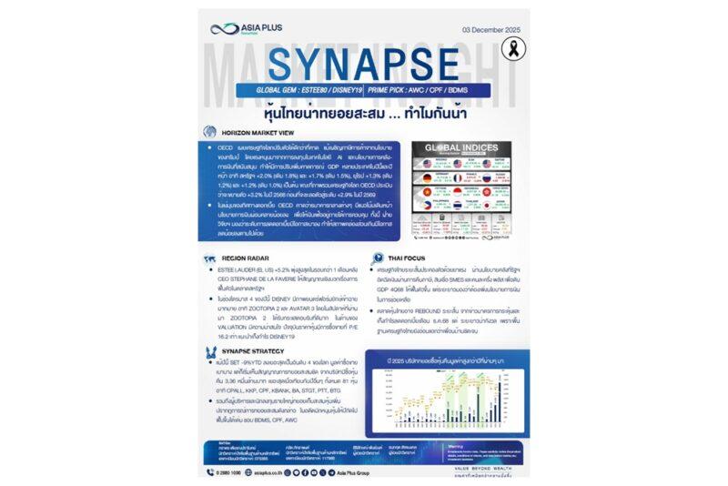 วันที่ 3 ธันวาคม 2568 บริษัทหลักทรัพย์ เอเซีย พลัส จำกัด (ASPS) เปิดเผยบทวิเคราะห์ระบุว่า แม้เศรษฐกิจโลกจะเผชิญแรงกดดันจากมาตรการภาษีของสหรัฐฯ ในยุคทรัมป์ แต่การประเมินล่าสุดของ OECD กลับมีน้ำเสียง “ดีกว่าคาด” โดยแรงขับเคลื่อนสำคัญมาจากการลงทุนด้านเทคโนโลยี AI และมาตรการการเงิน–การคลังในหลายประเทศที่ยังช่วยพยุงเศรษฐกิจได้ ส่งผลให้ตัวเลขคาดการณ์ GDP ของหลายภูมิภาคถูกปรับเพิ่ม ไม่ว่าจะเป็น สหรัฐฯ ปีนี้ +2.0% และปีหน้า +1.7% ยุโรป ปีนี้ +1.3% และปีหน้า +1.2% และภาพรวมเศรษฐกิจโลกคาดว่าจะเติบโต +3.2% ในปี 2568 ก่อนชะลอลงเล็กน้อยเป็น +2.9% ในปี 2569 อย่างไรก็ดี ในด้านดอกเบี้ย OECD ส่งสัญญาณว่าธนาคารกลางทั่วโลกอาจ “ผ่อนคลายน้อยลง” เพื่อควบคุมเงินเฟ้อให้กลับสู่กรอบ นั่นหมายความว่า สภาพคล่องส่วนเกินที่เคยเอื้อให้สินทรัพย์เสี่ยงปรับขึ้นง่าย ๆ อาจเริ่มน้อยลงในปีหน้า
